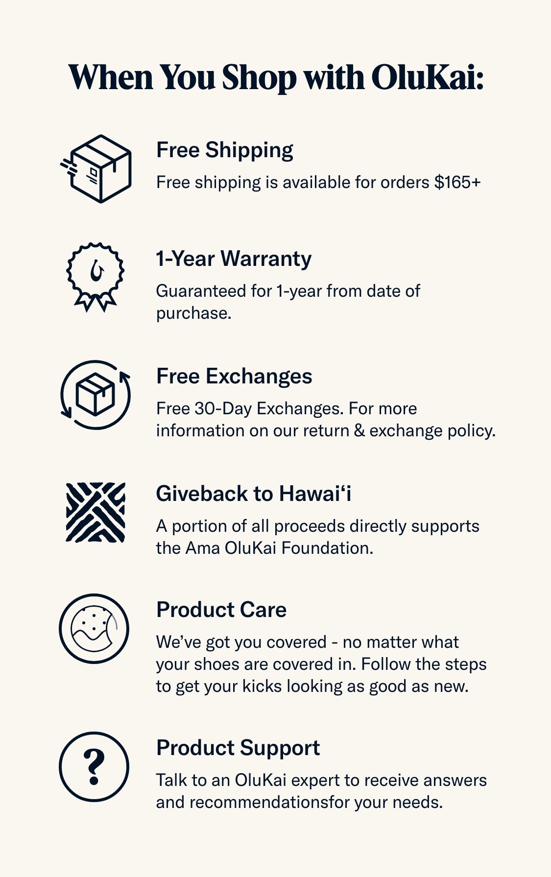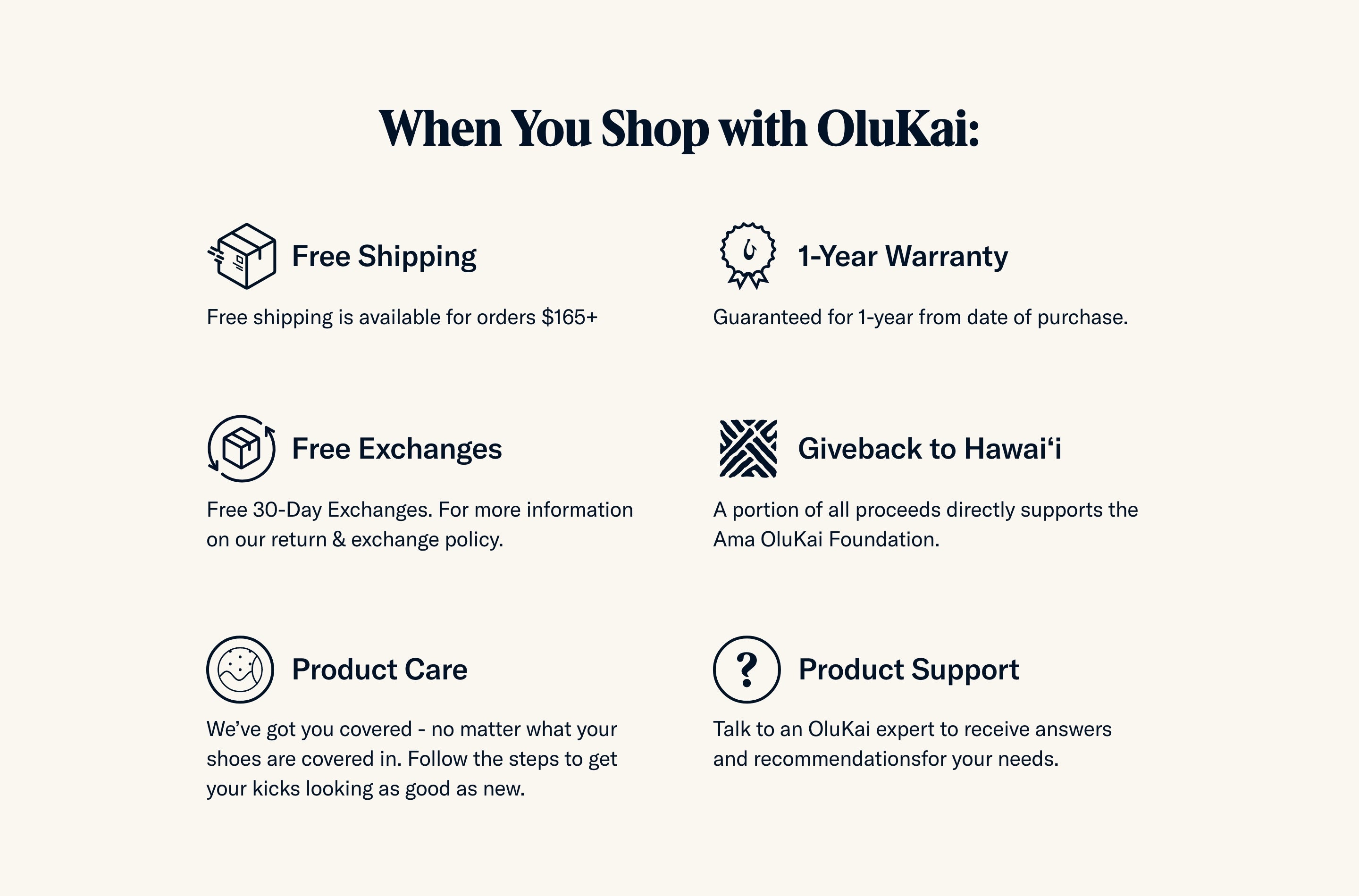 OluKai footwear is guaranteed from manufacture for one year from the date of purchase.