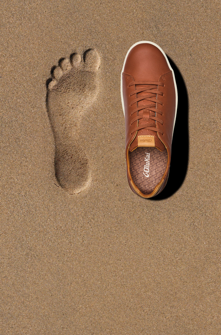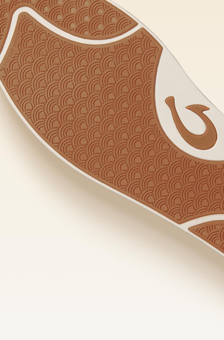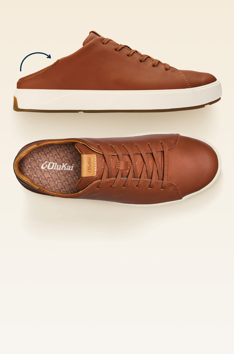 Made from premium full-grain waterproof leather, the Lae‘ahi Lī ‘Ili offers a blend of style and versatility with its natural color palette. The shoe is decorated with intricate debossed Hawaiian kapa artwork on the tongue, adding a touch of OluKai craftsmanship to its classic design.